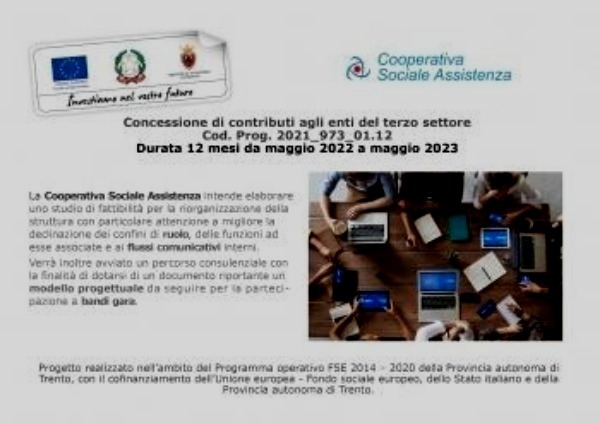 Cooperativa Sociale Assistenza scs è stata ammessa alla graduatoria per la concessione di contributi a soggetti del terzo settore per l’acquisizione di consulenze finalizzate alla riqualificazione e al miglioramento dell’erogazione dei servizi socio- assistenziali, nell’ambito del Programma operativo Fondo sociale europeo 2014-2020 della Provincia autonoma di Trento. Il contributo concesso per il progetto è pari a € 7.999,96.